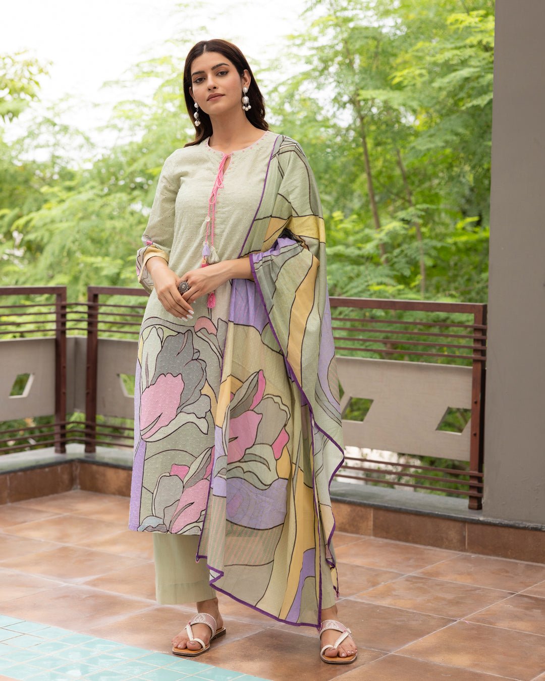 Style Tips: Opt for minimalist pearl accessories to let the floral print shine. Pair it with basic flats or juttis to complete the look.
